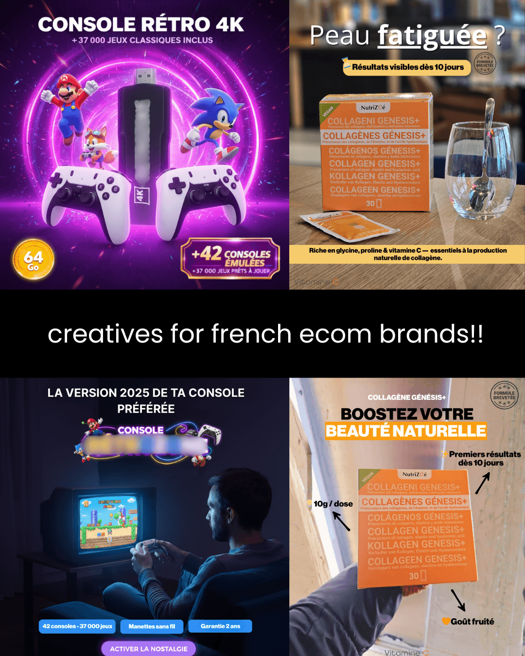 TikTok/Reels editing, Dubbing & localization (FR/US), Hook writing Storyboarding, Ad variations, Weekly creative drops